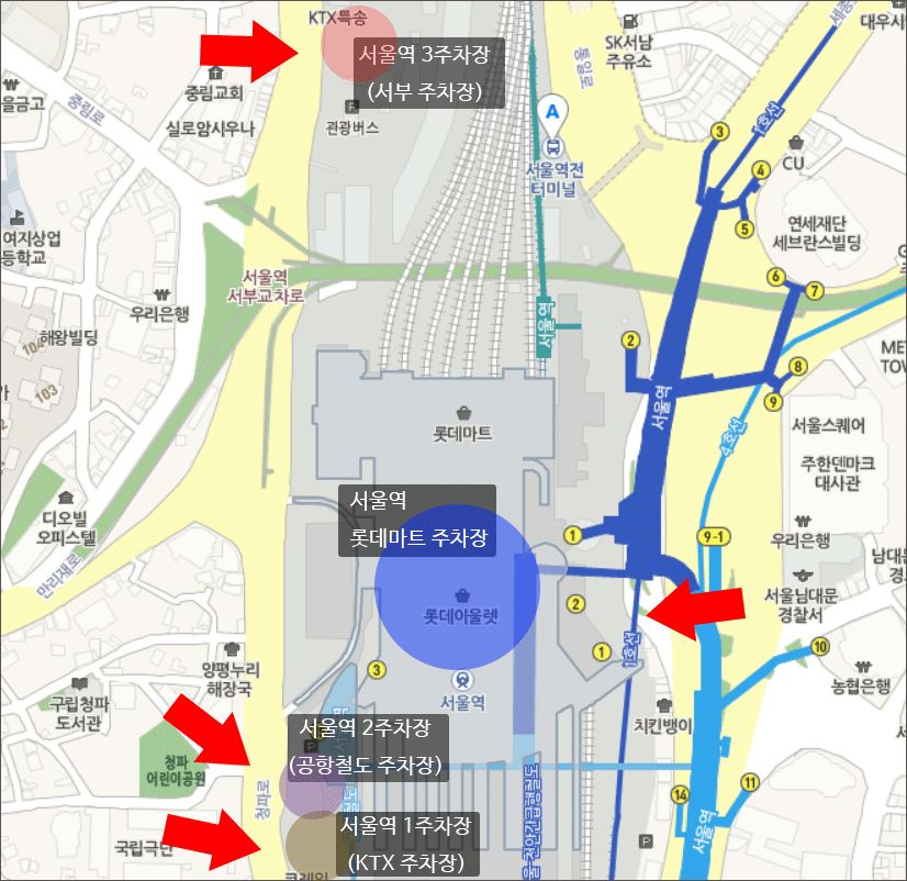서울역 주변의 인근 주차장은 모두 3곳에 마련되어 있는데요. 서울역 바로 옆에 있는 롯데마트 주차장, 그리고 지하에 위치한 공항철도 주차장, 서울역 뒷편에 위치한 서울역 KTX 빌딩 주차장이 있습니다.