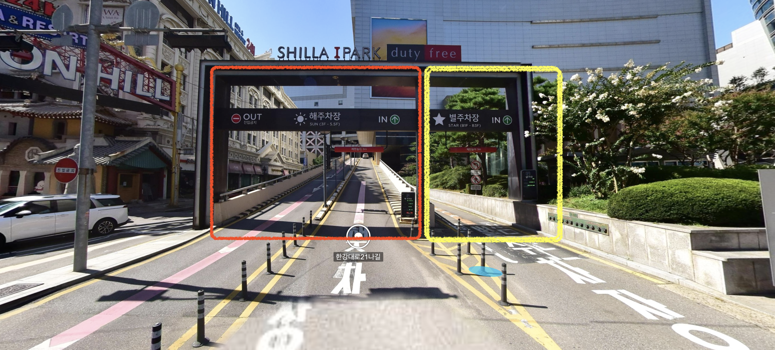 왼쪽으로 올라가시면 "해" 주차장, 오른쪽으로 직진하시면 별 주차장으로 진입하게 됩니다.