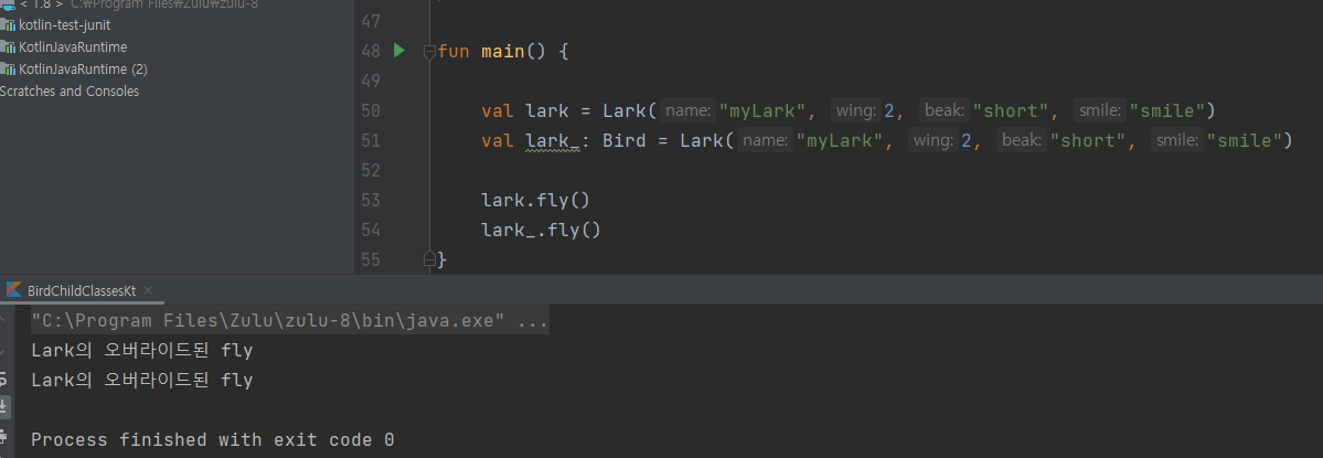 하지만 두개 모두 lark클래스의 fly메소드가 실행되었는데요